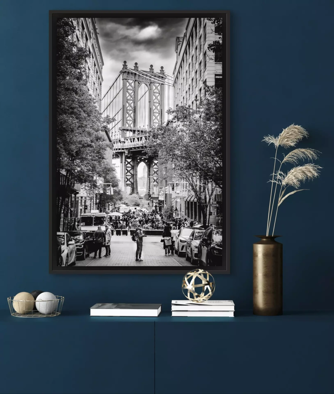 Der wohl berühmteste Brückenpfeiler der Welt in der Straßenschlucht von Brooklyn, die Passanten im Vordergrund geben dem Monument die passende Dimension